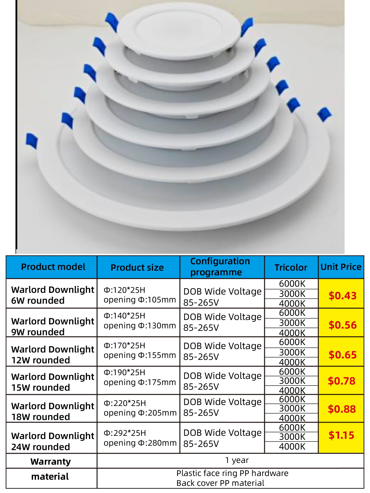| Warlord Downlight 18W rounded | 6000K/4000K/3000K | $0.88 |