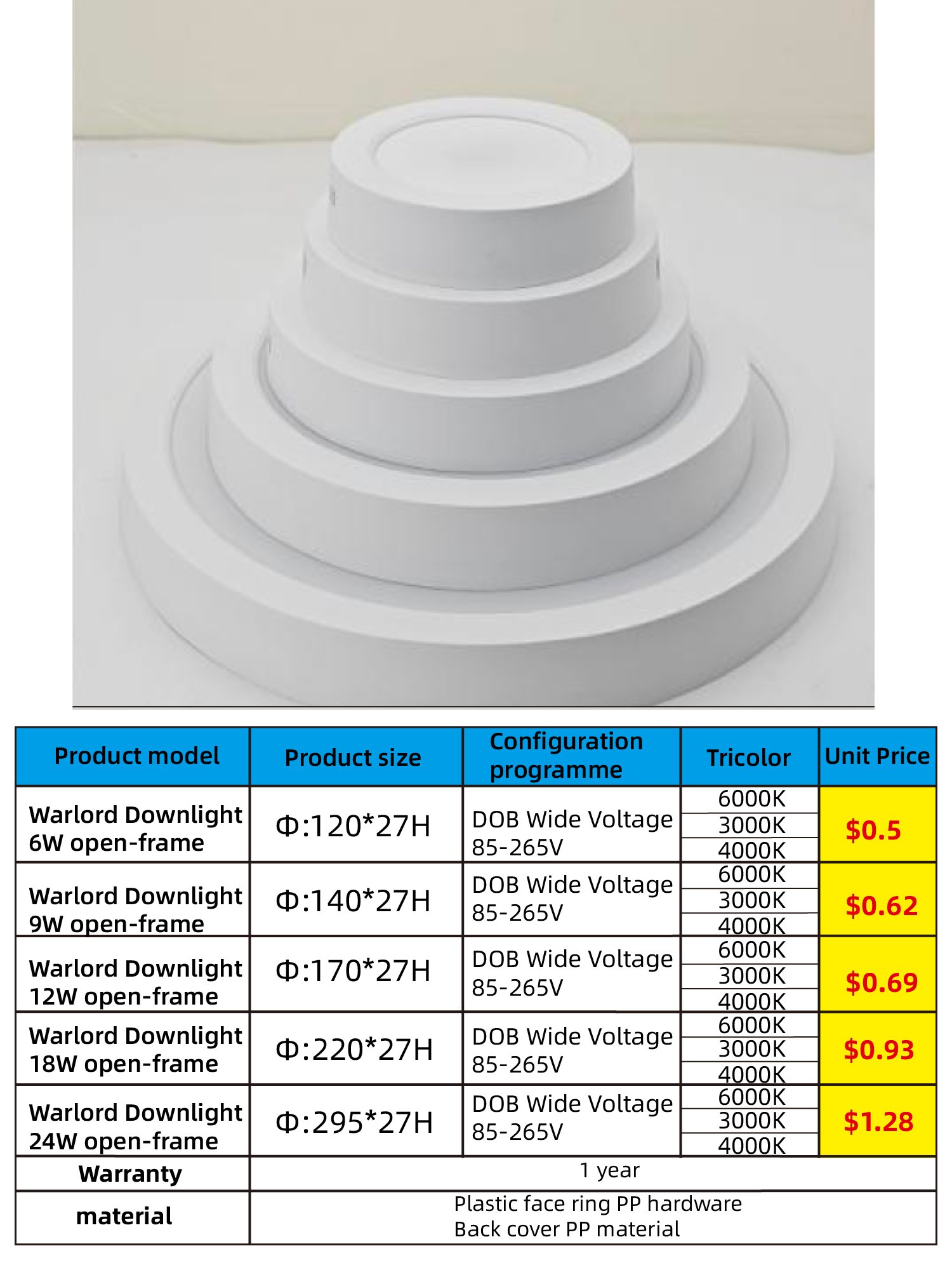 Warlord Downlight 24W open-frame 6000K/4000K/3000K $1.28